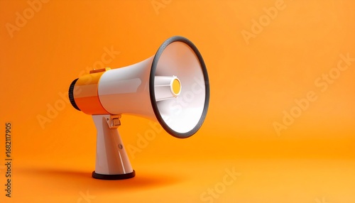 megaphone, announcement, speaker, communication, loud, audio, message, alert, news, broadcast, marketing, promotion, advertising, voice, speech, sound, information, business, concept, symbol, icon, attention, signs, studio shot, isolated, white, orange, background, object, illustration, technology, device, digital, modern, style, copy space, closeup, front view, horizontal, equipment, speak, echo