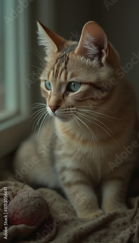 Orange Tabby Kitten Sitting by Window with Calm and Curious Expression