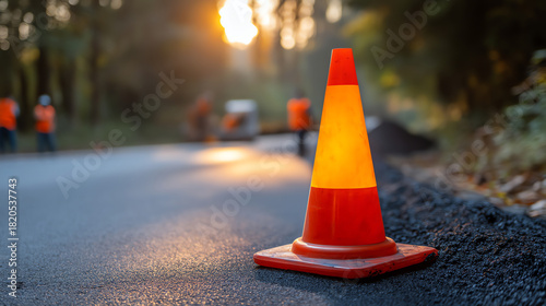 Orange traffic cone on freshly paved road with workers and equipment blurred in the background during sunset or sunrise in a forested area