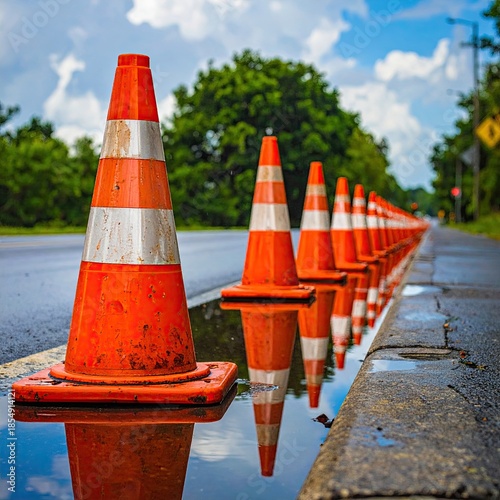 cone, traffic, orange, white, safety, road, puddle, row, construction, caution, warning, barrier, wet, pavement, marking, lane, sidewalk, water, daylight, sky, tree, summer, exterior, line, perspective, closeup, horizontal, shallow, depth, sharpened, detail, maintenance, repair, control, order, direction, limitation, guidance, security, protection, alert, signalling, regulation, visual, composition, photo