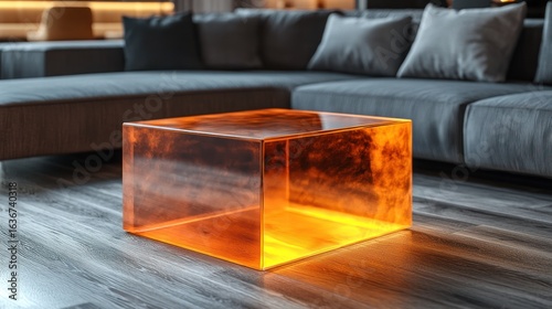 modern, living, room, hot drink, table, glasses, orange, light, interior, design, furniture, contemporary, sofa, grey, cushion, wooden, floor, acrylic, glowing, abstract, geometric, square, transparent, illuminated, warm, ambient, space, home, furnishing, art, decor, style, stylish