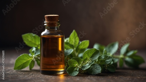 oregano leaves background with aroma therapy massage essential oil bottle from Generative AI