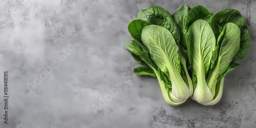 Organic bok choy, a type of Chinese cabbage, is beautifully arranged on a grey concrete background. This green organic bok choy offers fresh appeal with ample copy space in this top view flat lay.