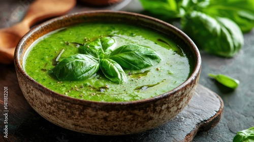 organic green vegetable soup served in a rustic bowl with fresh basil and spinach leaves on top.