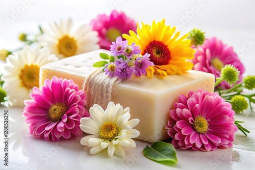 Organic Handmade Soap with Flowers, White Background - Natural Skincare Product