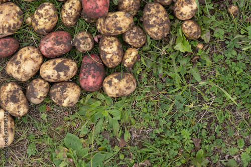 organically grown and hand - picked potatoes are put to dry in a green grass