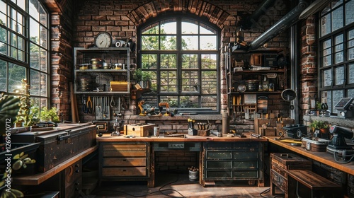 empty, workbench, sit, workshop, with, tool, organised, shelf, the, background, neatly, arranged, surface, space, craft, storage, equipment, clean, professional, preparation, supply, industry, design, workspace, area, project, material, systematic, efficient, creative