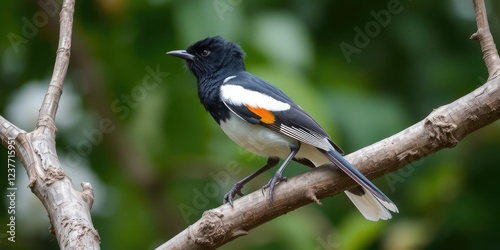 Oriental magpie robin bird perched on a tree branch in natural habitat, outdoors, perching