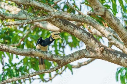 Oriental Pied Hornbill on tree branch in Khaoyai National Park Thailand