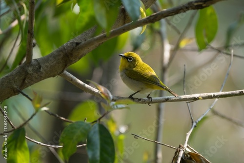 Oriental White-eye (Zosterops palpebrosus) perched on a tree branch in a lush forest setting