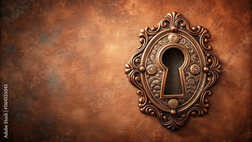 Ornate antique keyhole on rich brown textured background