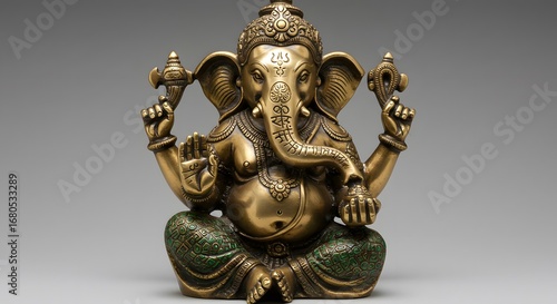 statue, elephant, deity, bronze, sitting, ornate, grey background, intricate, religious, cultural, spiritual, indian, artifact, sculpture, carving, figurine, symbol, handcraft, antique, tradition, hinduism, artistic, macro, detailed, metallic, indoor, representation, decorative