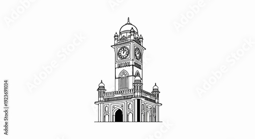 architecture, structure, building, tower, clock, time, dial, hand, mechanical, historical, landmark, historical building, ornate, intricate, detailed, design, facades, entrance, arch, window, dome, church steeple, pinnacle, turret, rooftop, stone, brick, elevation, vignetting, drawing, outline, black, white, monochrome, old, vintage, classic, traditional, aesthetic, artistic, graphic, visual, iconic, prominent, central, symmetric