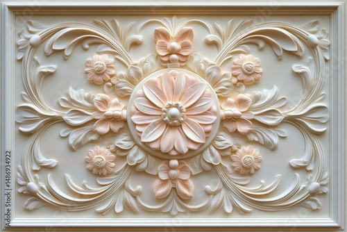 panel, decorative, floral, carving, relief, pastel, ornate, design, texture, light, cream, beige, pink, peach, butterfly, flower, round, center, detail, symmetric, elegant, intricate, classic, style, art, motif, pattern, symmetry, embossed, ornament, carving, detailing, element, artwork, subtile