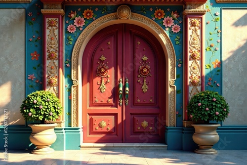 Ornate doorway with peacock and lotus motifs in vibrant colors , architectural detail, lotus flower