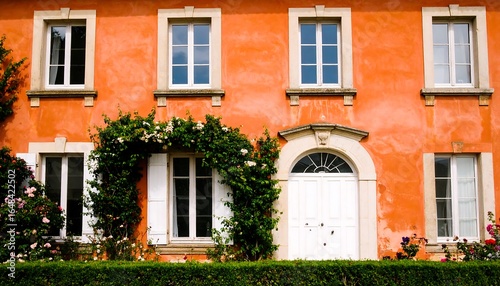 orange, building, facades, house, window, door, ivy, flower, garden, white, shutter, arch, trim, classic, exterior, architecture, european, charming, vibrant, colours, detail, symmetric, lush, green, foliage, plant, rose, hedge, fresh, bright, warm, sunny, vintage, traditional, beauty, structure, horizontal, vertical, pattern, detail, rustic, decoration