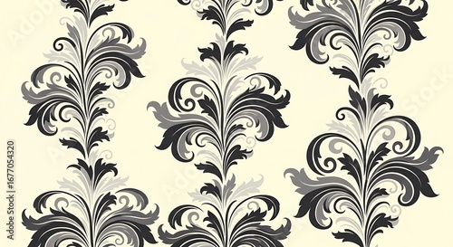 pattern, floral, design, ornament, decorative, black, grey, cream, background, leaf, vine, elegant, repeating, motif, texture, seamless, vector, illustration, graphic, art, wallpaper, fabric, print, background, vintage, classic, style