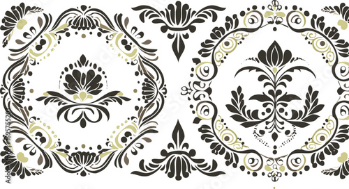 floral, scrollwork, ornate, decorative, vintage, damask, flourish, botanical, pattern, dark brown, graphic, design, element, border, symmetric, elegant, intricate, traditional, art nouveau, ornament, flower, vector, decoration, illustration, seamless, set, wallpaper, frame, art, leaf, decor, baroque, swirl, texture, style, scroll, ornamental