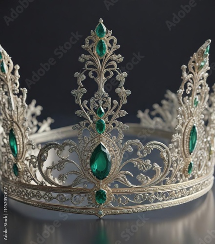Ornate tiara design with intricate white gold and emerald details, glitz, grandeur, award show