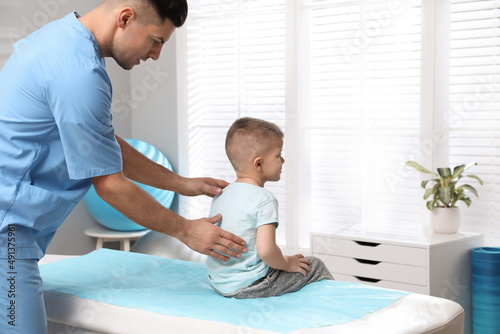 Orthopedist examining child's back in clinic. Scoliosis treatment
