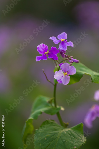 Orychophragmus violaceus blooms in violet — tender green leaves herald spring, soft-focus backdrop evokes dreamy natural serenity