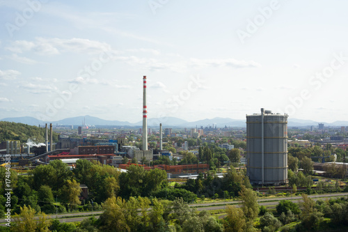 Ostrava cityscape - industrial factory and city. Beskid mountains ( Beskids ) in the background. Industrial town in the Czech Republic, Czechia