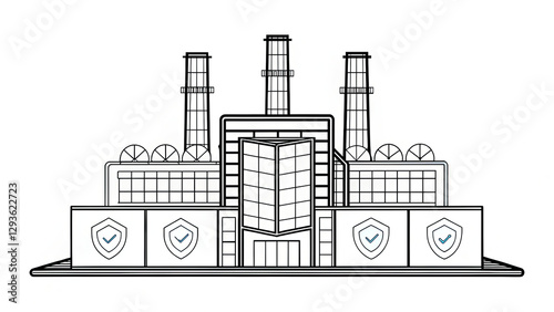 OT security. A simplified line drawing of a factory featuring smokestacks, large windows, and shield symbols, emphasizing industrial architecture.