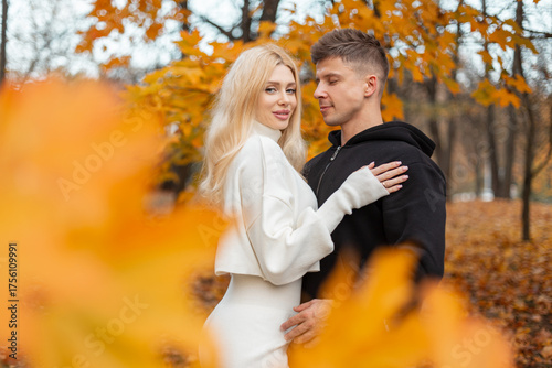 oung couple in love standing close in an autumn park, surrounded by yellow and orange leaves. Romantic fall atmosphere and tender relationship moment outdoors.