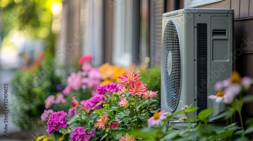Outdoor AC unit with flowers. An air conditioning unit is installed outside a house, with flowers in the foreground.
