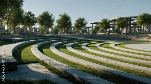 amphitheatre, seating, layered, architecture, landscape, tree, environment, day, sunny, park, structure, stone, grass, curved, tier, open air, natural, scenery, design, empty, no people, modern, contemporary, urban, construction, venue, performance, stage, garden, recreation, place, area, view