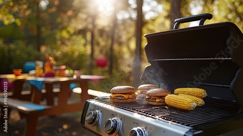 Outdoor Barbecue with Grilled Burgers and Corn on the Cob in a Sunlit Forest Setting