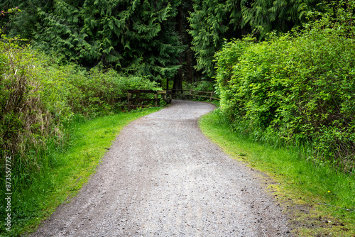 Outdoor nature recreation, gravel walking and biking path through open area with salmonberry bushes into a cedar tree forest with wood fencing, peaceful green and fresh air