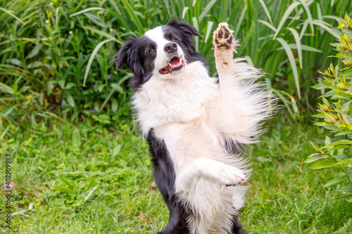 Outdoor portrait of cute smiling puppy border collie sitting on grass park background. Little dog with funny face jumping in sunny summer day outdoors. Pet care and funny animals life concept