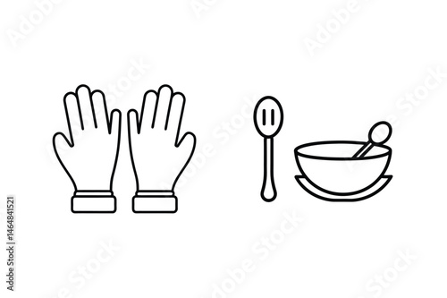 kitchen, utensil, glove, outline, vector, icon, cooking, receipe, food preparation, clean, hygiene, safety, bowl, spoon, spatula, minimal, simple, monochrome, black, white, illustration, graphic, design, element, concept, health care, protection