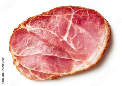 meat, cured, ham, slice, pork meat, red, pink, brown, cooked, food, fresh, isolated, top, view, oval, delicious, protein, pale, texture, fat, marbling, crispy, browned, edible, quality, healthy, nourishment, portion, whole, processed, tasty, appetising, savoury, image, food photography, raw, closeup, detail
