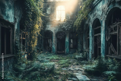 abandoned, overgrown, courtyard, urban, apocalypse, vegetation, jungle, dilapidated, city, new york city, landscape, vine, plant, cinematic, photorealistic, golden light, soft light, decay, desolation, landmark, ruin, daytime, nobody, generative, illustration, stillness, futuristic, silent, mystery, contrast, forgotten, wilderness, nature, depth, scale, atmosphere