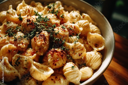 pasta, dish, food, closeup, creamy, rustic, shell, bowl, overhead, texture, delicious, epicure, cookery, italian, macaroni, cheese, sauce, fresh, herb, thyme, seasoning, appetising, cooked, meal, lunch, dinner, vegetarian, comfort, homemade, favor, gold, brown, aesthetic, photo, macro, detail, white, background, isolated, ingredient, presentation, gastronomy, savoury, warm, deliciously, noodle, surface, bright
