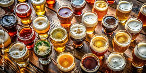 Overhead shot: a craft beer flight, showcasing diverse brews from a brewery.
