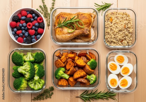 berry, chicken, rosemary, broccoli, egg, bowl, container, food, meal, healthy, fresh, cooked, vegetable, fruit, protein, grain, alimentary, balanced, diet, lunch, dinner, breakfast, snack, portion, control, glasses, wooden, table, top, view, overhead, shot, arrangement, ingredient, colourful, delicious, savoury, wholesome, organic, natural, homemade, easy, convenient, lifestyle, fitness