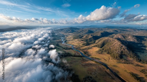 aerial, view, river, vale, mountain, cloud, nature, landscape, midday, breathtaking, terrain, scenic, beautiful, geography, water, ecosystem, tranquil, vegetation, wilderness, exploration, adventure, travel, hill, flowing, blue, sky, horizon, sunlight, vista, panoramic, earth, environment, canyon, stream, peaceful, untouched, natural, beauty, serene, atmospheric, summer, green, biodiversity, remote, wild, open, space, distant