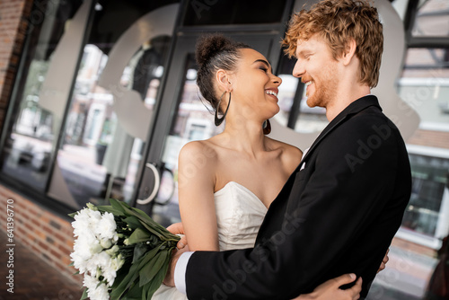 overjoyed redhead man with flowers embracing elegant african american bride on urban street