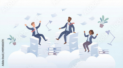 Overwhelmed and exhausted office workers drowning in paperwork and stress