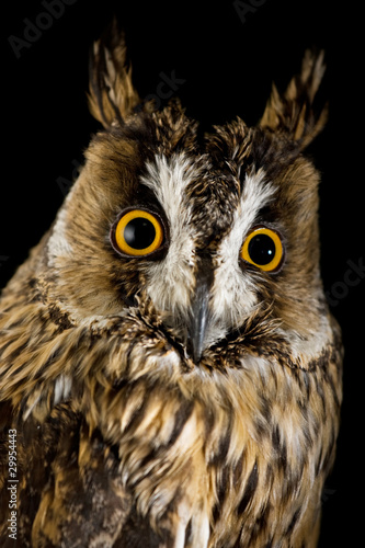 owl, night, bird, yellow, feathering, plume, single, widener, stretch, plumage, nature, defend, white, background, bough, closeup, prey, predator, vermin, horned, ear, closeup, colours, green, dark, black