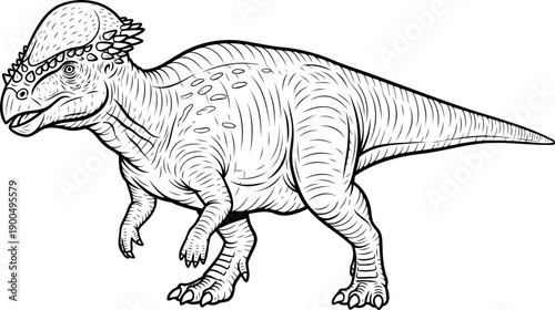 dinosaur, herbivore, dome, prehistoric, cretaceous, extinct, animal, reptile, creature, ancient, fossil, paleontology, biology, nature, wildlife, walking, illustration, drawing, vignetting, line art, black-and-white, monochrome, graphic, design, science, icon, symbol, isolated, transparent, clip art