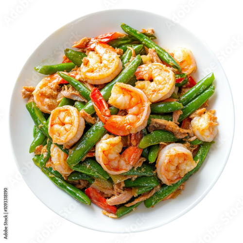 Pad Sataw, stir-fried stink beans with shrimp or pork, bold and pungent Southern dish, isolated on white background