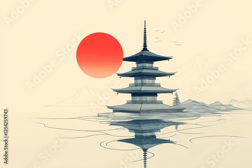 pagoda, japan, sunrise, water, mountain, temple, asia, zen, calm, peace, serenity, calmness, landscape, scenery, artwork, illustration, art, design, background, travel, culture, oriental, spiritual, minimalist, elegant, beautiful, nature, sky, sun, quiet, peaceful, stillness, harmony, balance, meditation, contemplation, serene, tranquil, hope, inspiration, wisdom, ancient, mystical, aethereal, iconic