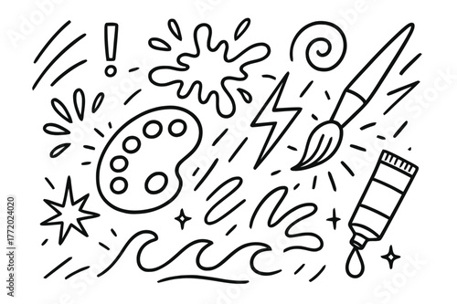 painter, energy, burst, hand, drawn, doodle, illustration, brush, palette, motion, line, splash, swirl, lightning, exclamation, hand-drawn
