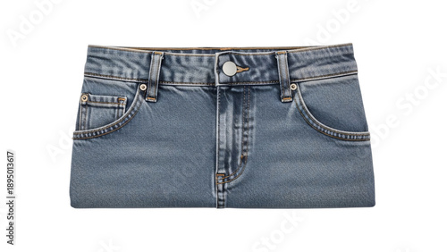 Pair of blue denim with white button front and black button at.