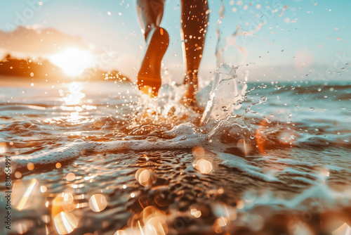 Pair of feet splashing in the ocean waves along a sandy beach, capturing the joy and freedom of a carefree day by the sea