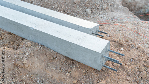 Pair of long square precast concrete pillars resting horizontally on a mound of excavated earth at a construction site. Pillars have exposed steel rebar ends at the front.